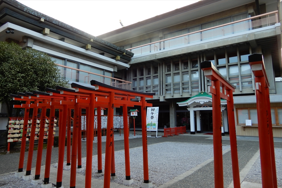 戦後の昭和26年(1951)、京都伏見稲荷大社の神示により御分霊を勧請、東京と横浜の間に位置する当地に創建。社殿は日本最大級の九棟稲荷造りで、108体の神狐の像が置かれている。