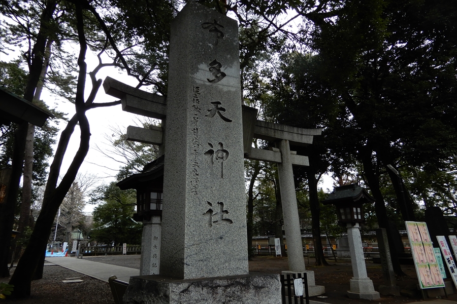 延長5年(927)制定の法典「延喜式」に名を連ねる多摩地方有数の古社で、第11代垂仁天皇の御代、約1940年前の創建。文明9年(1477)に多摩川の洪水を避け、古天神より現在地に遷座され、その時ご祭神少彦名命に菅原道真公を配祀した。布田五宿の総鎮守で、五宿天神として崇め祀られている。