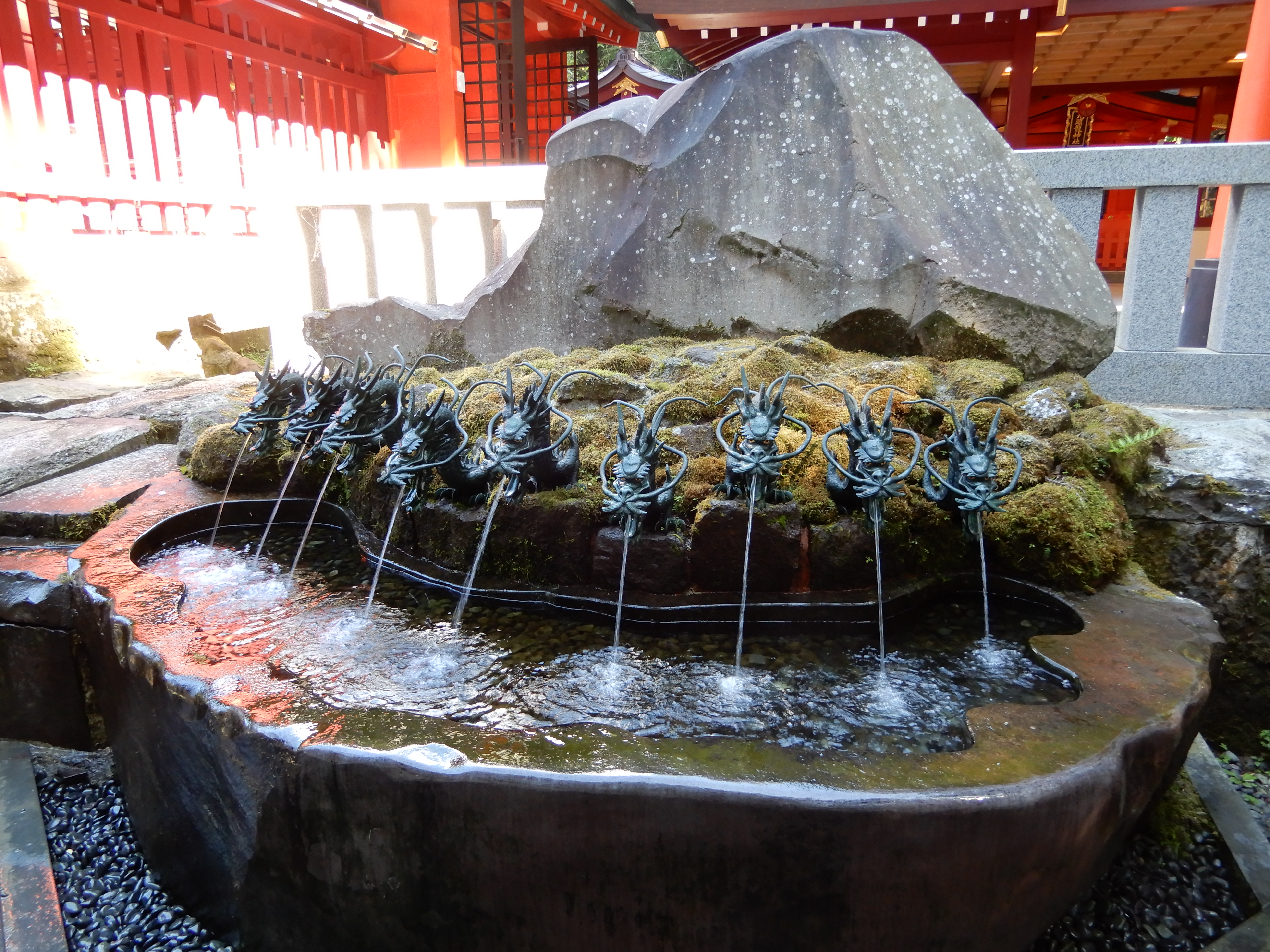 近年、縁結びの神として名高い九頭龍神社は、箱根神社中興の祖、万巻上人が芦ノ湖で鎮めた九頭龍の伝説に起因し、箱根神社の末社という位置づけです。箱根神社内には箱根大神(三神)を祀る御本殿の他、森深くなかなか本宮にお参りできない里人のために建てられたのがこの「九頭龍神社 新宮」になります。