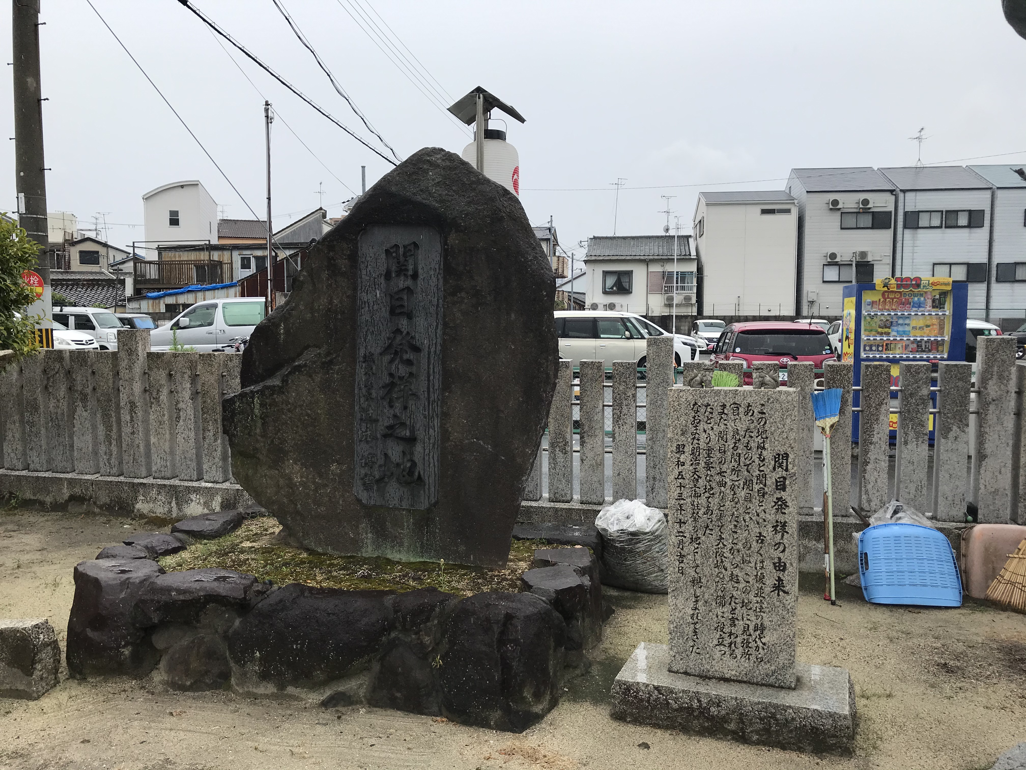 当地の氏神様である関目神社は、天正八年、豊臣秀吉が大阪築城の際、防備の一策として関 目より古市森小路の間十余町の道路を特に屈折させて(俗に七曲がりという)敵兵の進軍を俯瞰 し、その軍容兵数を察知するのに便利なようにした。これと同時に北の護りとして武神の須佐之男尊を祀り、崇敬すると共に、浪速の鬼門に当るので、鬼門鎮護の神として、毘沙天王を勧請して小祠を建立したことに始まる。